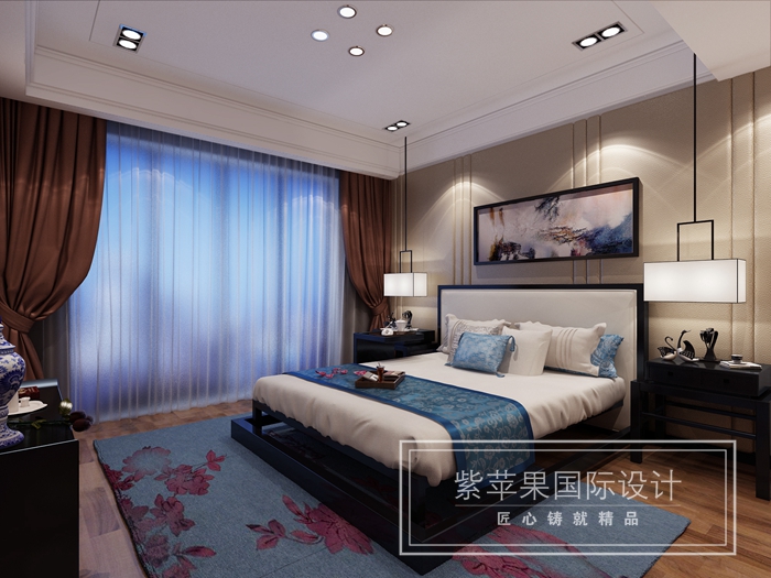 餐廳區(qū)域獨立開辟出一塊羅漢床位置,融合了圍棋對弈、擺件展示、喝茶區(qū)的多功能空間,也使得整個公共區(qū)域更添一抹文化的氛圍和質感,臥室里大面積藍色的運用使整個空間更加靜謐安然,有助于忙碌一天的主人更好的入眠,此案活潑大膽的用色體現(xiàn)了設計師對于色彩的把握,讓我們體驗到了不一樣的新中式。