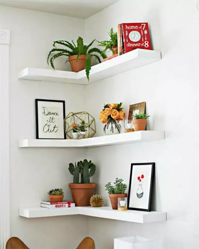 像上圖這樣安裝幾層轉(zhuǎn)交式的置物架是個(gè)不錯(cuò)的主意。簡單放上鮮花綠植、畫作和小裝飾就已經(jīng)很漂亮,當(dāng)然,你還可以用來放書,或者漂亮的餐具。不過在放的時(shí)候一定要考慮到置物架的承重能力,以免發(fā)生意外。