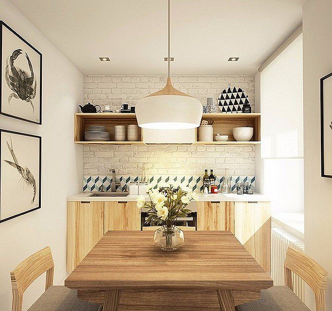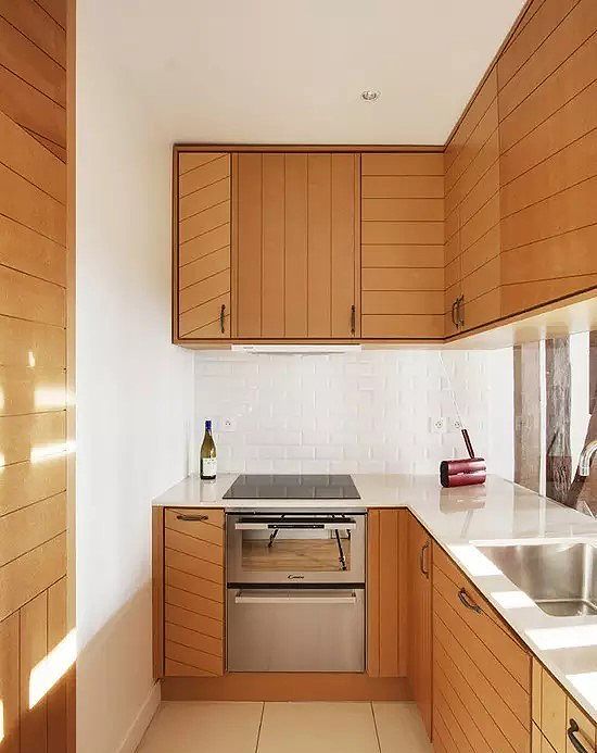 1)一字型:即做菜流程都在一條動(dòng)線上,只占用一面墻,比較節(jié)省空間。