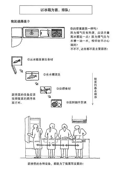 廚房的設(shè)施布置應(yīng)該按照做菜的順序來(lái),從冰箱拿出食材-清洗-處理-烹調(diào),要符合廚房的操作流程,胡亂設(shè)置廚房設(shè)施的話,累的一定是你……