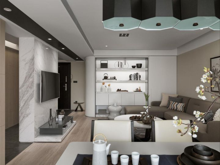 如果客廳還要兼做工作區(qū),就要考慮書桌書柜的位置;