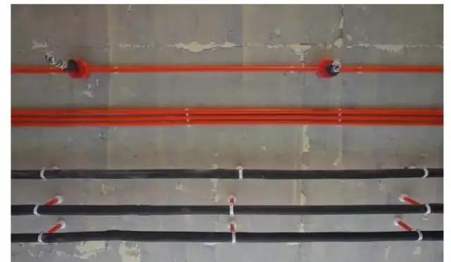 電源線、信號(hào)線必須穿入阻燃型線管或黃蠟管內(nèi),地面線管用鍍鋅管卡固定,頂面、墻面線管用中心卡固定。