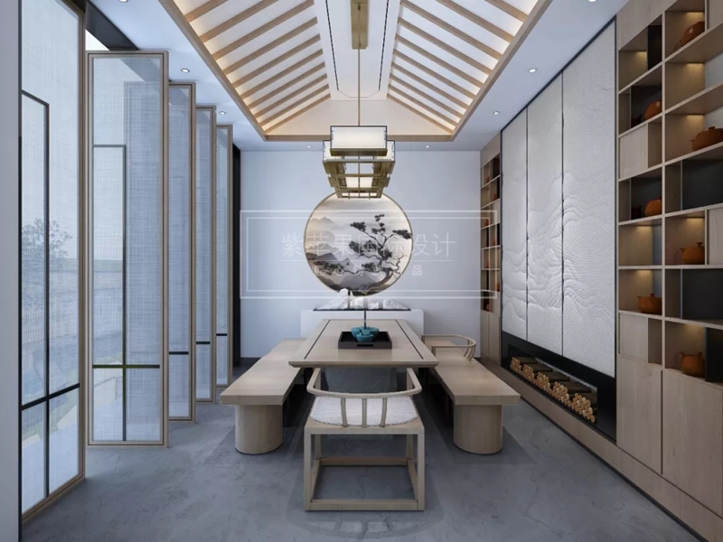 茶室的布置順延墻壁,寬敞的茶桌連接著水墨畫背景的卡座,半墻的壁的展示架等,無論是坐在卡座上品茶還是站起來望著窗外的風景微風輕輕拂過,如此自然舒暢。