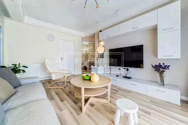 電視背景墻也可以很好的利用起來,在墻上打上一整面柜子,兼顧好看又實用。