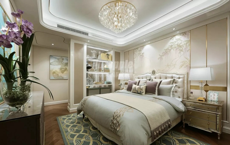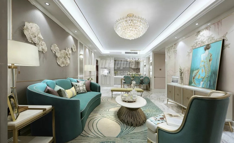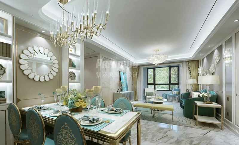 本案戶型方正,動線明朗,因此設計時在結構上未做過大調整。空間整體以白色與米色大面積渲染,同時穿插少許奢華的金色點綴空間,整體色調更加豐富而高級。地板選擇了大理石系,軟裝則以藍色色系修飾空間,通過色系的延伸,保持空間跳色風格的連貫性。