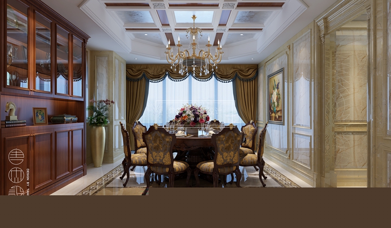 客餐廳空間色彩層次豐富,呈現(xiàn)出歐式風(fēng)格的華貴和浪漫。在布局上采用對(duì)稱,配合地面豐富的歐式拼花,每個(gè)元素都蘊(yùn)藏著卓然的審美品位,演繹出一曲華貴典雅美妙樂(lè)章。