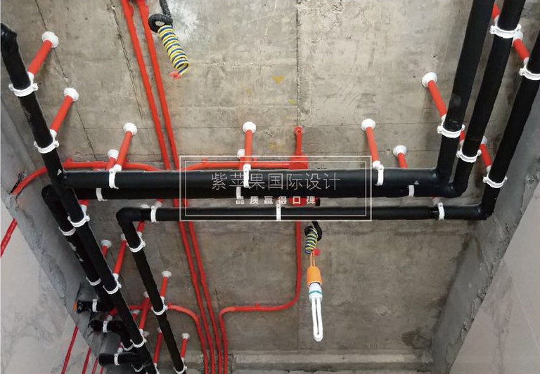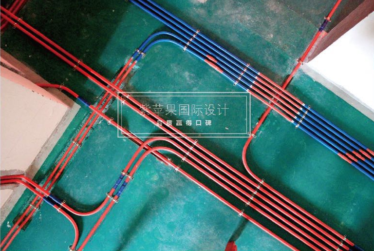 從上到下為電路、熱水管、冷水管、回水管、下水管,相鄰管線不接觸