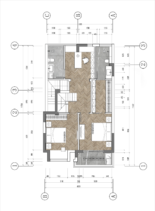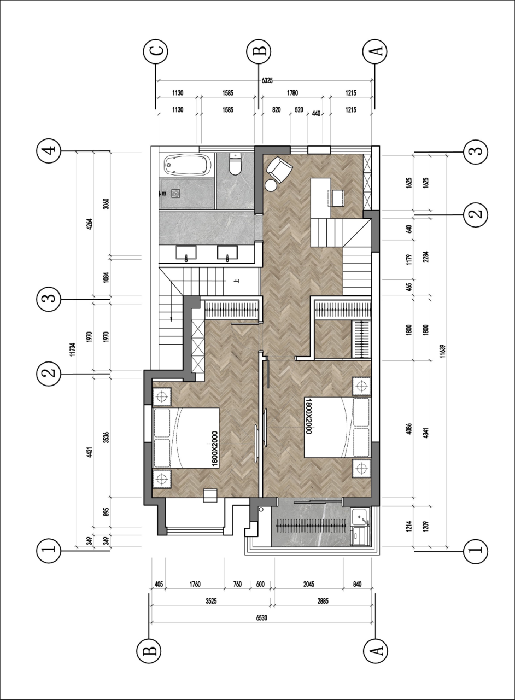 二樓方案①主臥和次臥做了兩個(gè)小套房,衛(wèi)生間做到了北面。連接開放式書房。