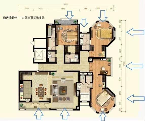 通透性主要是指戶型的通風(fēng)和采光性能。要保證戶型具有良好的通透性能,首先要求戶型要有良好的進(jìn)深開間比,即戶型比較方正;其次戶型最好有兩面可以采光和通風(fēng),相對(duì)兩面采光通風(fēng)最佳(如南北、東西)。
