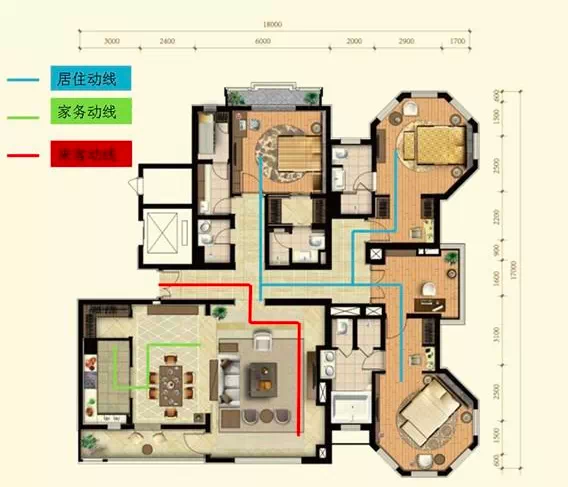 好的動(dòng)線能夠提升戶型利用率,而差的動(dòng)線會(huì)使大戶型變得“大而無當(dāng)”,浪費(fèi)空間。戶內(nèi)主要?jiǎng)泳€有三類,分別是居住動(dòng)線、家務(wù)動(dòng)線、來客動(dòng)線。