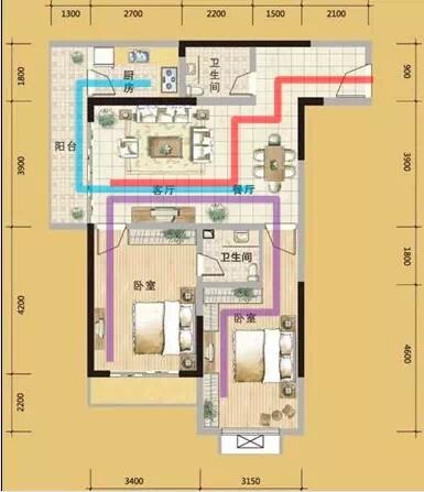 動(dòng)線良好(從入戶門進(jìn)客廳、臥室、廚房的三條條線不會(huì)交叉)范例如下: