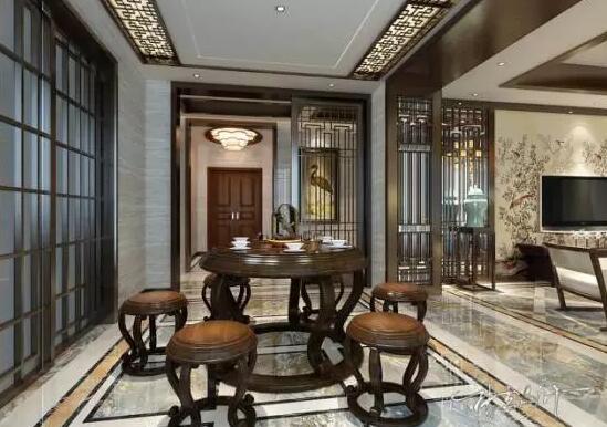 3、裝飾色彩:新中式風(fēng)格的家具多以深色為主,墻面色彩搭配:一是以蘇州園林和京城民宅的黑、白、灰色為基調(diào);二是在黑、白、灰基礎(chǔ)上以皇家住宅的紅、黃、藍(lán)、綠等作為局部色彩。