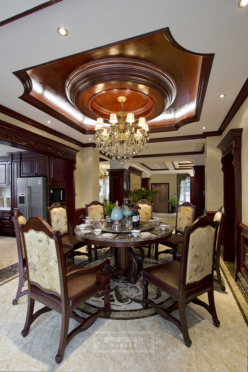 餐廳吊頂?shù)脑煨蛯哟胃袠O強(qiáng),四邊的吊頂不會(huì)讓圓形吊頂太過(guò)于突兀。圓形元素從頂部,餐桌貫穿到地面拼花。