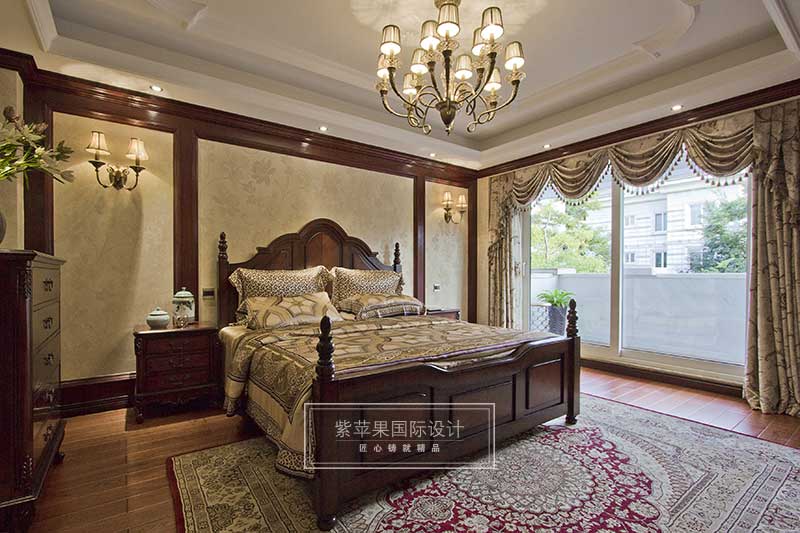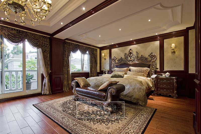 臥室空間以暖色調(diào)為主,呈對(duì)稱(chēng)性的床頭裝飾面板設(shè)計(jì),淡黃色壁紙,華美燈飾,恢弘大氣,雕琢精致的家具,舒適的床品,面積寬大的華麗地毯,種種細(xì)節(jié),勾勒出尊貴典雅,溫馨享受的臥室空間。