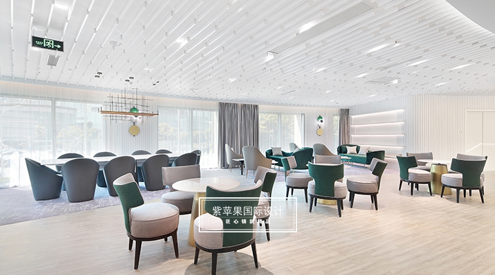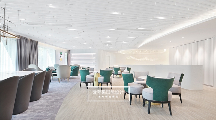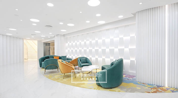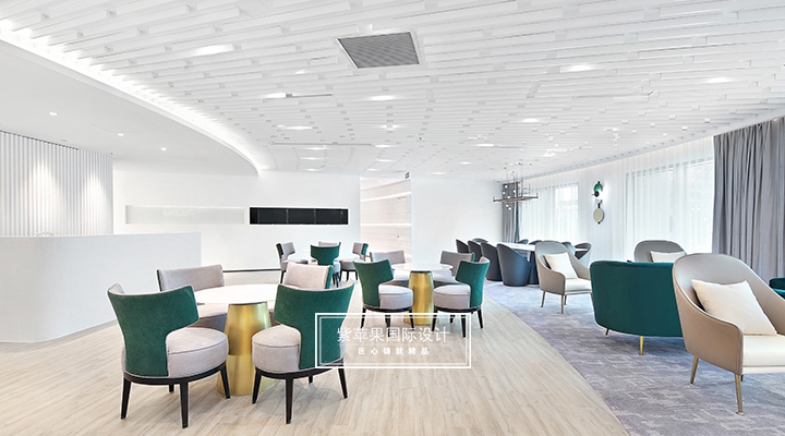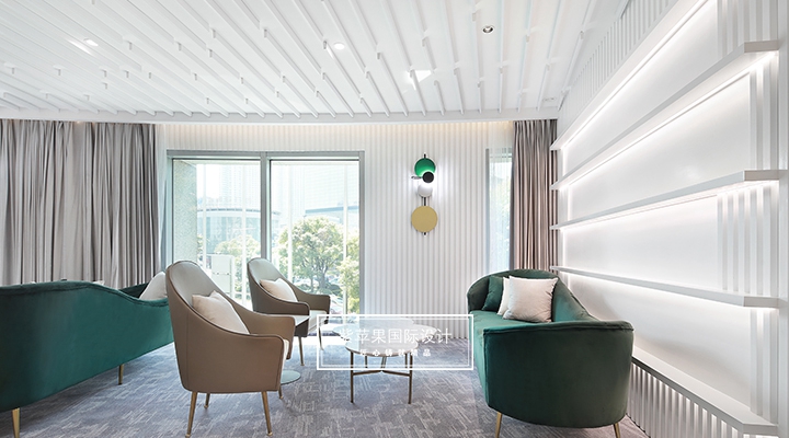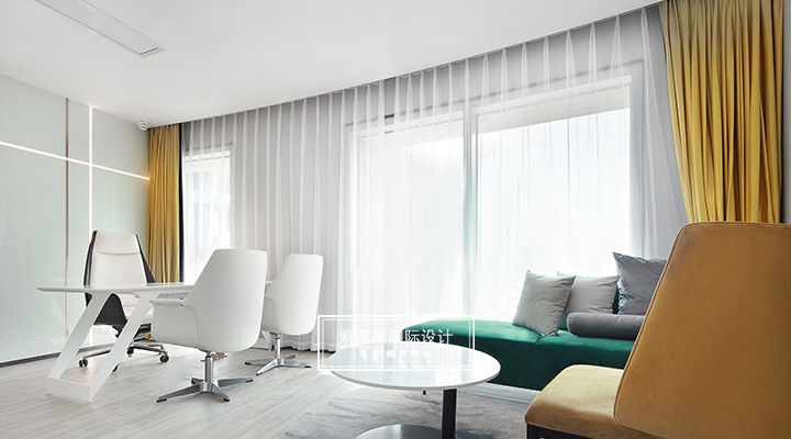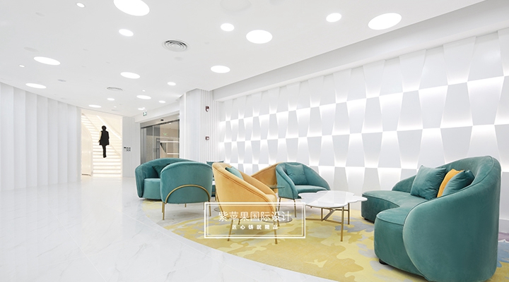 大堂設(shè)計(jì)貼合現(xiàn)代極簡(jiǎn)理念,充分利用空間安置多功能區(qū),大面積留白的區(qū)域搭配由明黃、湖綠和金屬色組成的軟裝,軟硬裝格調(diào)統(tǒng)一凸顯質(zhì)感。二樓地面多采用地板、地毯等材質(zhì),有效降低女士腳踩高跟鞋發(fā)出的噪聲干擾,也會(huì)提高她們?cè)谧呗窌r(shí)感受到的舒適感。洽談區(qū)的落地玻璃窗廣納自然光線,將朝暮風(fēng)光、四時(shí)景致全盤納入其中,為空間點(diǎn)染別樣雅致的氣息。