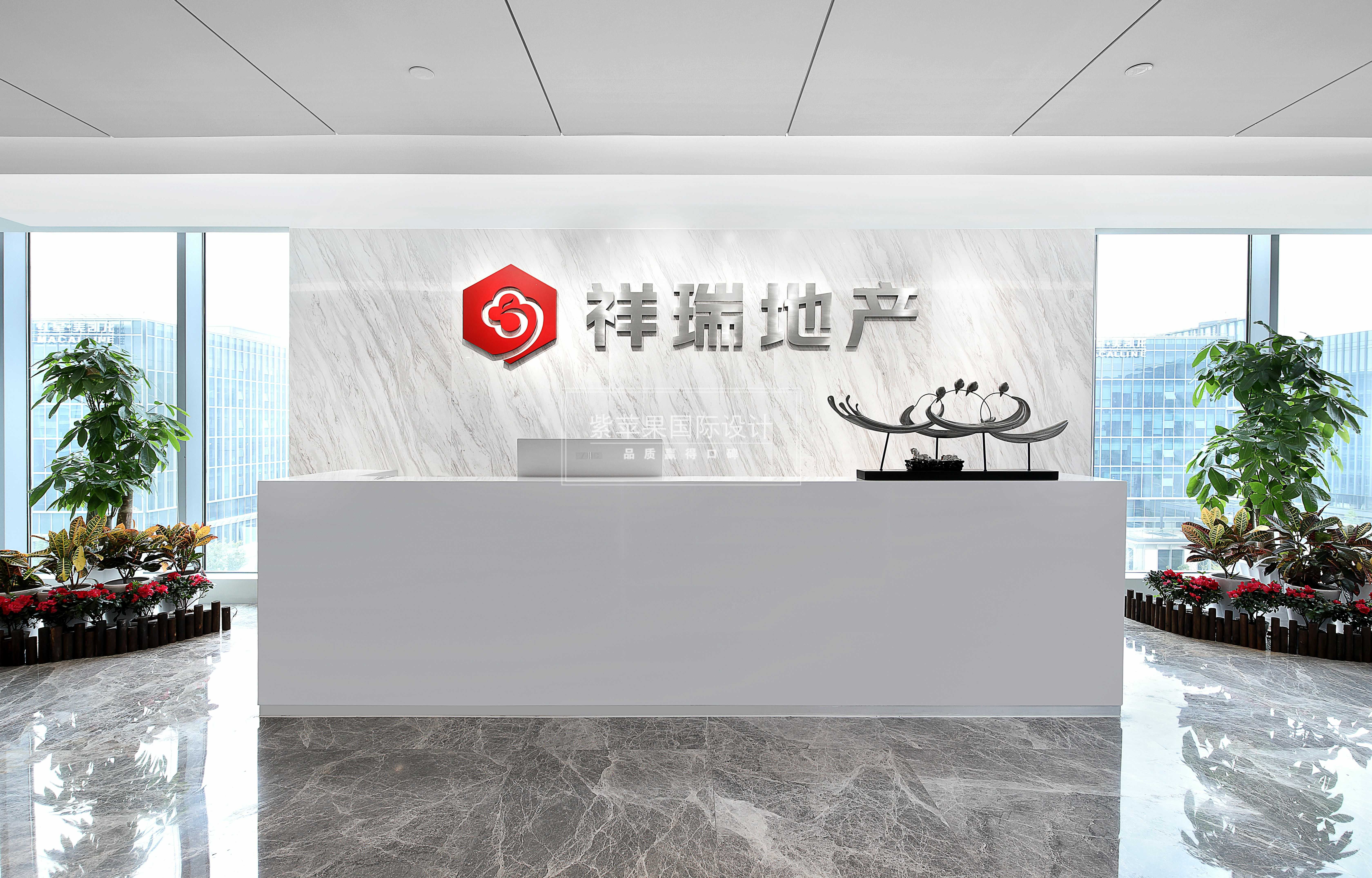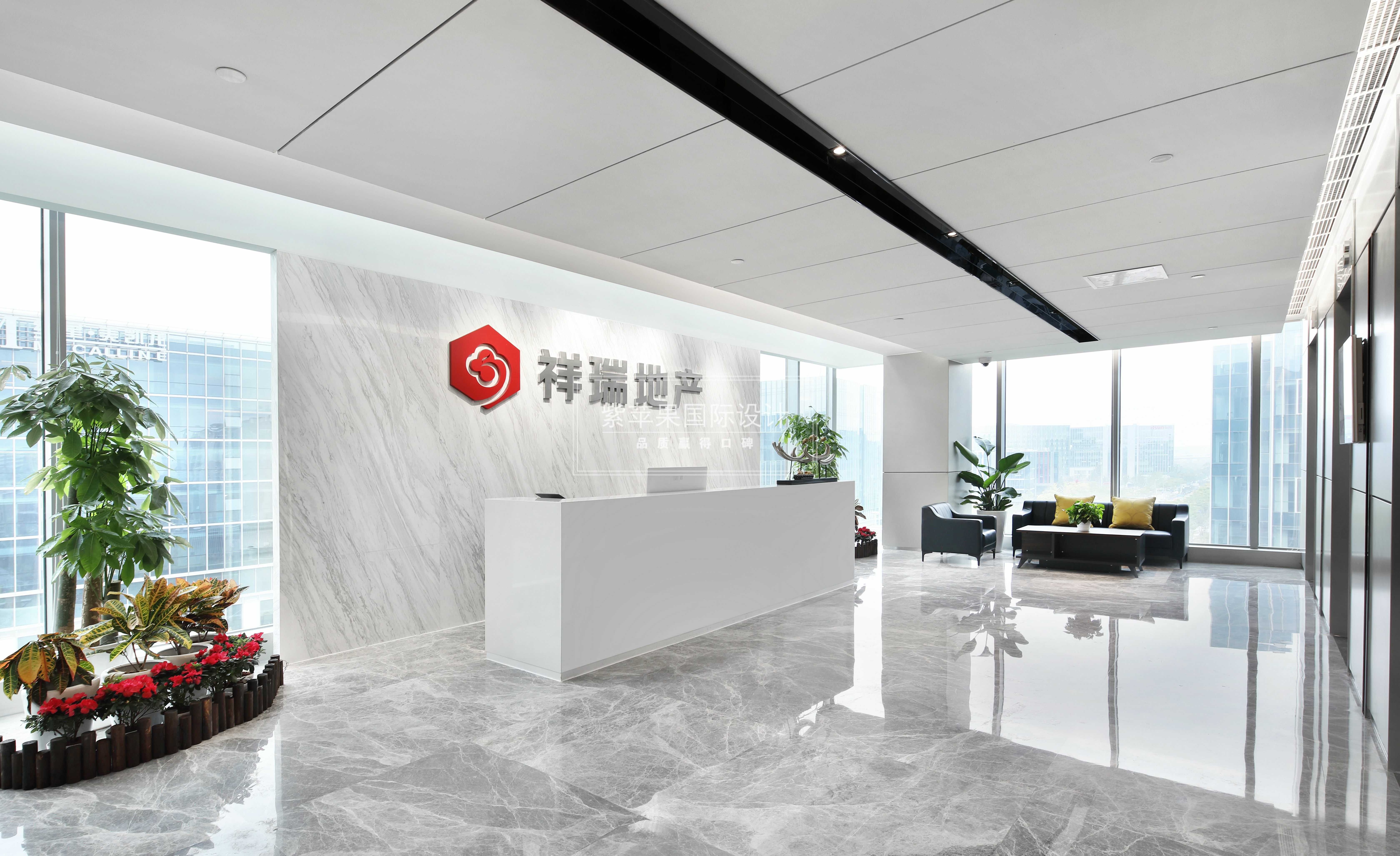 一出電梯間,映入眼簾的就是祥瑞的前臺(tái)處。大面積留白的區(qū)域顯得寬敞大氣、不拘小節(jié)。采用經(jīng)典黑白的色彩搭配,兩旁角落處用綠植盆栽作加飾,不失商務(wù)禮儀和氣度。