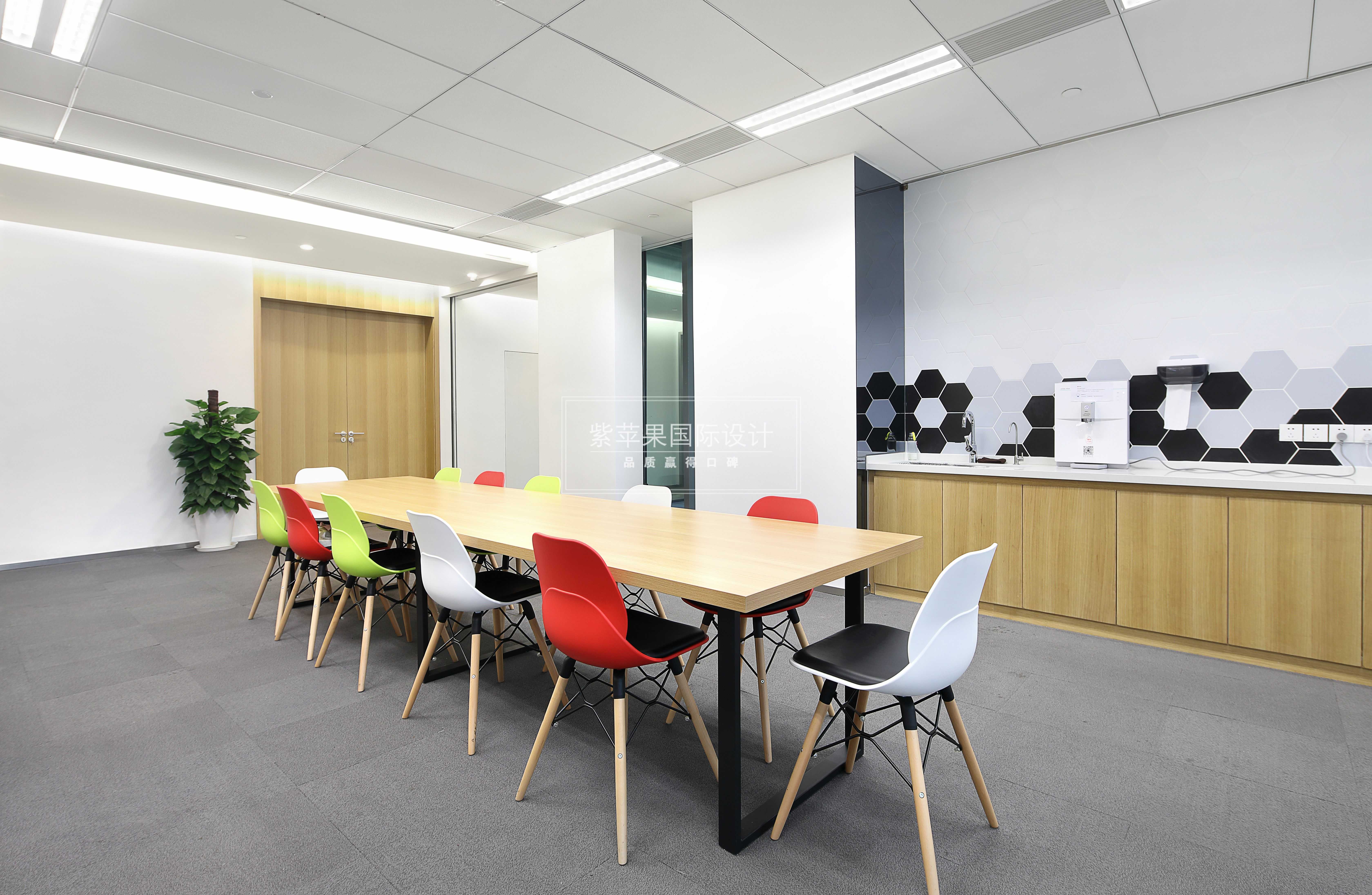 一層茶歇區(qū)設(shè)置在進(jìn)門的拐角處,簡(jiǎn)單的木質(zhì)長桌圍繞著一圈彩色的座椅,接水處的墻壁采用了多邊形拼花造型,溫馨色調(diào)打造了簡(jiǎn)約明快的休憩場(chǎng)所。