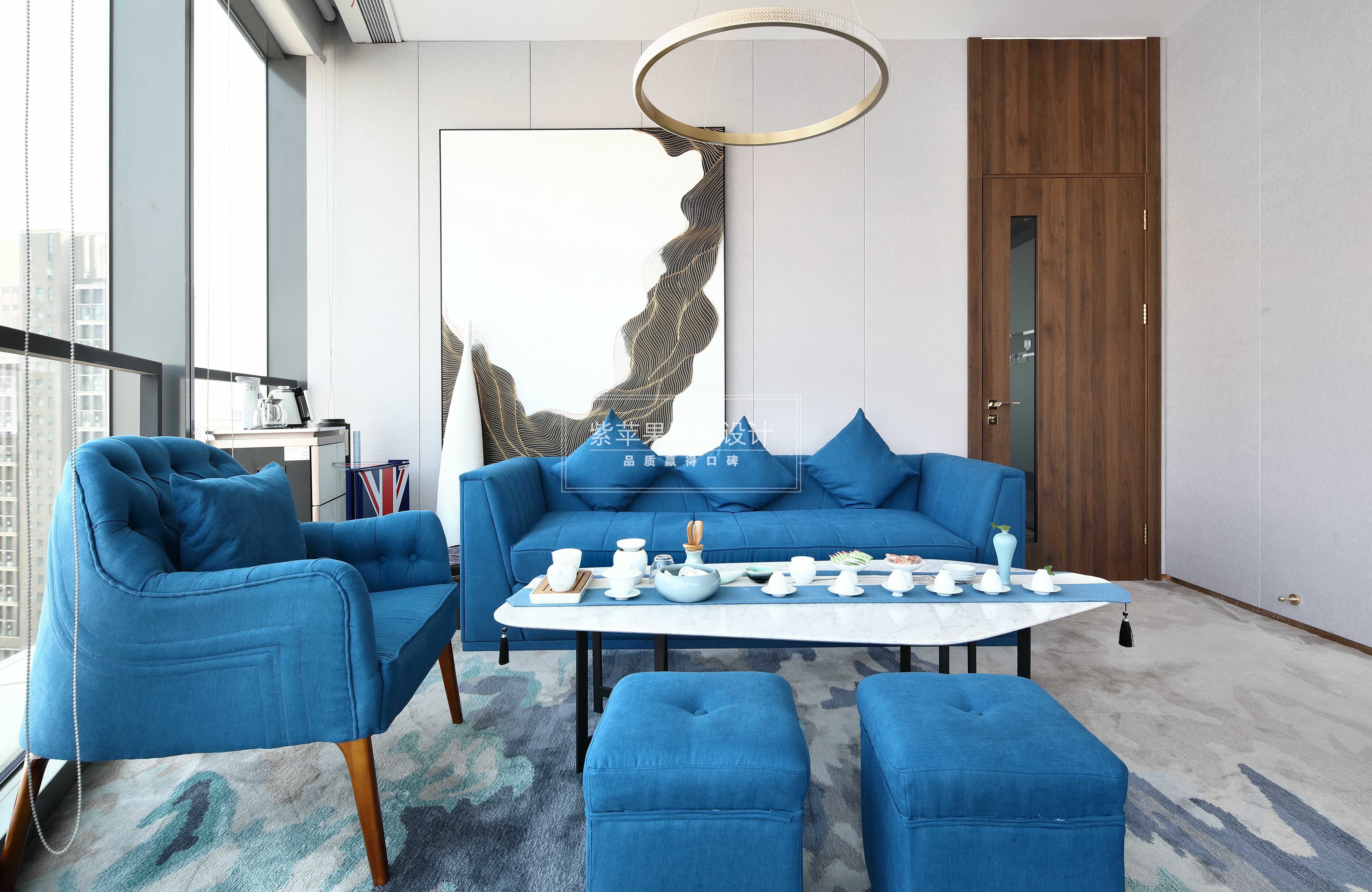 洽談區(qū)選用湖藍(lán)色作為軟裝布藝沙發(fā)的主基色,與水波紋的地毯搭配的恰到好處。矮桌上的淺藍(lán)色茶具精致小巧,室內(nèi)不同明度的藍(lán)色在色調(diào)上保持一致,給人視覺上柔和素凈的感官體驗(yàn)。