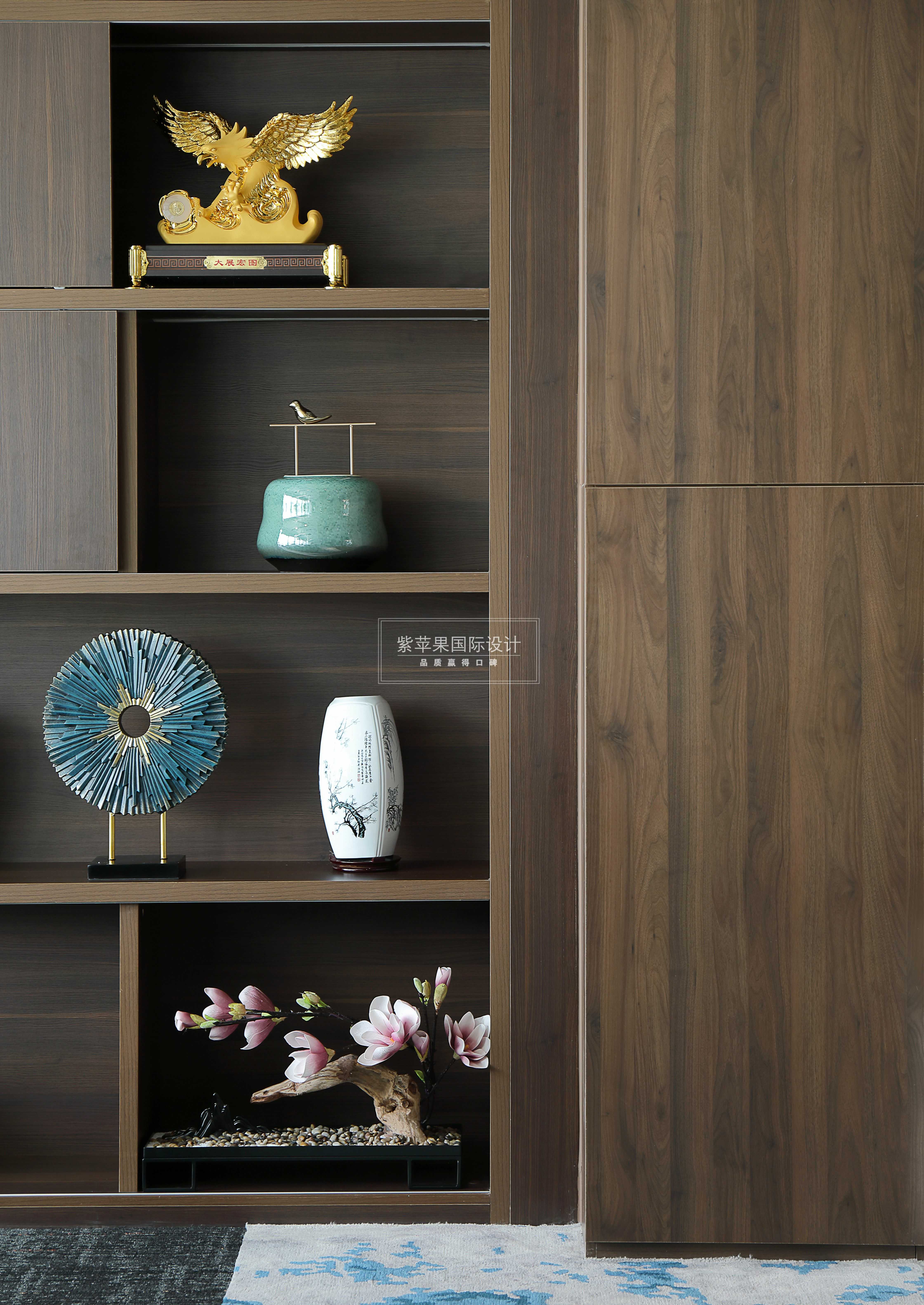 靠墻位置用一面半開放式的展示柜作墻面造型,收藏了很多形狀、顏色及材質(zhì)各異的藝術(shù)品,每個(gè)藝術(shù)品都有其內(nèi)在的深層含義,既彰顯了公司主人的獨(dú)特品位,又增添了空間的質(zhì)感和藝術(shù)觀賞性。