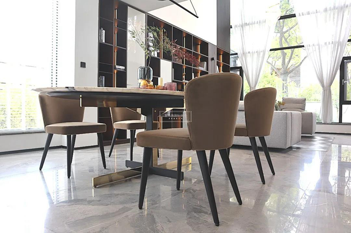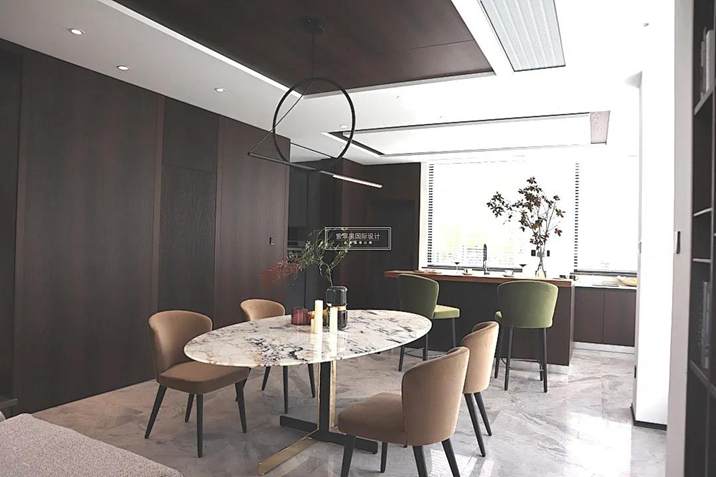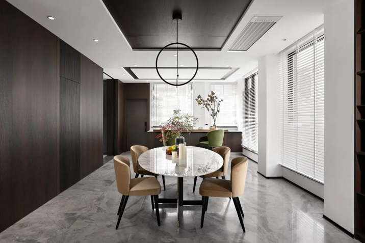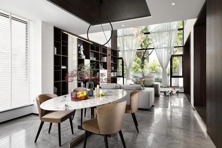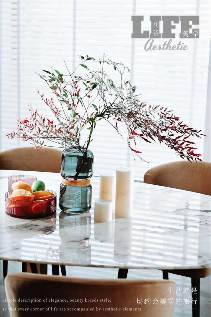 餐廳區(qū)域簡潔明快,大理石巖板的桌面光彩照人,自然紋理和花木映照疊疊重重相得益彰。