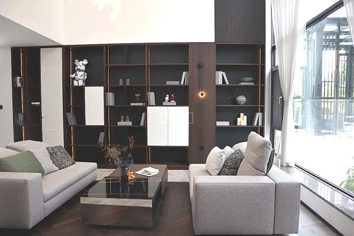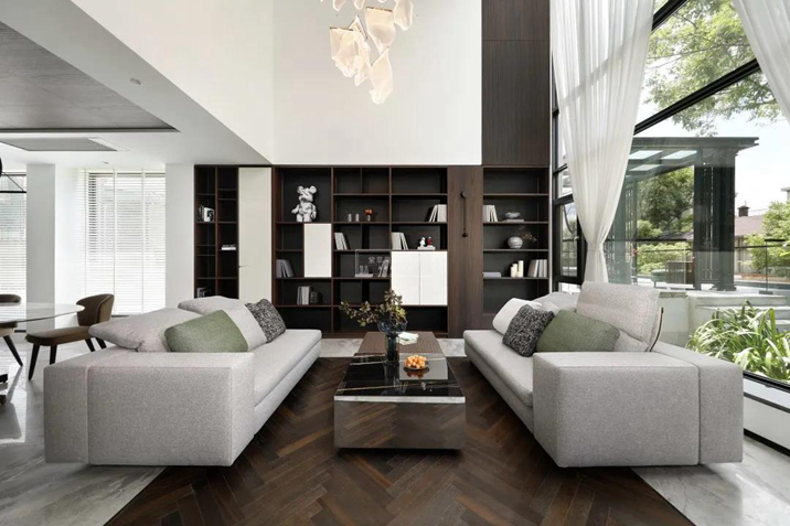 The high space of the living room makes it more stretched. The exquisite chandelier carrying the elements of flowing water opens the new aesthetic expression of life.