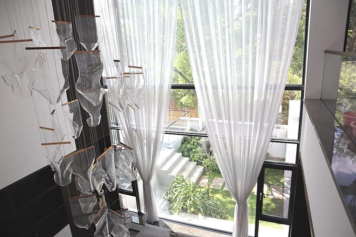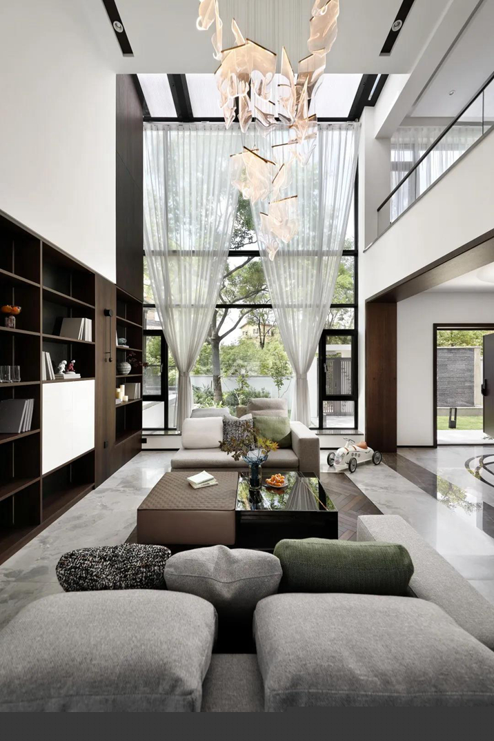 客廳本身的大挑空讓空間更有拉伸,參考行云流水的元素的精美吊燈打開生活新的美學表達。