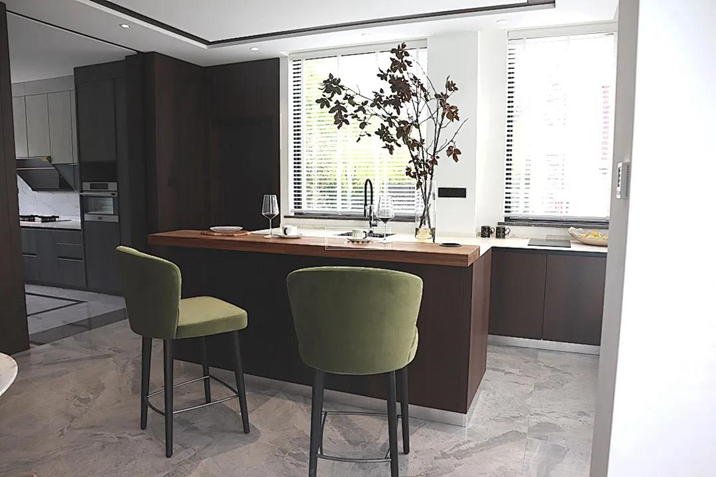 廚房區(qū)分為中西廚,考慮中廚習慣規(guī)避隱患提升居住品質(zhì),增加西式吧臺為多樣生活提供更多的選擇性。